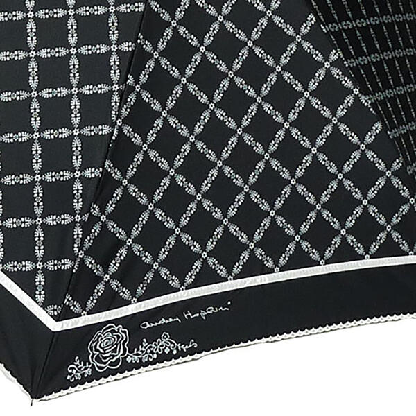 エスニックな花格子プリントと無地の切り返し、白色サテンテープでトリミングしてワンポイントにローズ花をプリントして、おしゃれな晴雨兼用傘に仕上がりました。