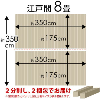 【江戸間8畳用ウッドカーペット】 ■商品サイズ タテ×ヨコ:約 350×350cm(約175×350cm×2本のセット) 厚み:約 0.6cm 板幅:約 5cm ■梱包サイズ 2梱包(下記サイズが2個届きます) 約 21×21×181cm ■重量 約 20kg×2 ■素材 表面:コルク 中材:合板 裏面:不織布(フエルトのような素材) ■角タイプ 角丸仕上げ。