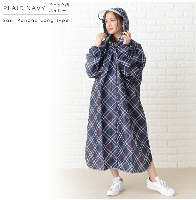 軽量 レインコート 自転車 男女兼用 袖付き レインポンチョ 前開きジッパー ポンチョ レインウェア 袖あり レディース メンズ バイク 雨合羽 カッパ 水玉 ドット柄 ブルー ネイビー チェック柄 ブラック おしゃれ ロング クリアバイザー 雨具